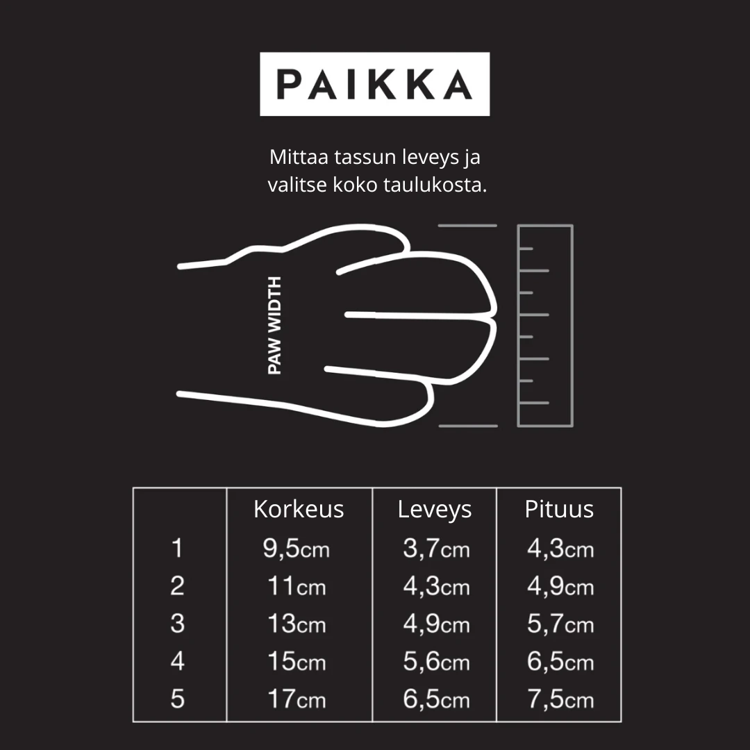 PAIKKA All-Weather Dog Shoes -malliset koiran tossut on suunniteltu pysymään hyvin jalassa kaikissa aktiviteeteissa. Ne soveltuvat niin rauhallisille arkilenkeille kuin haastavampiin ulkoiluseikkailuihin, tarjoten luotettavaa suojaa ja käyttömukavuutta.